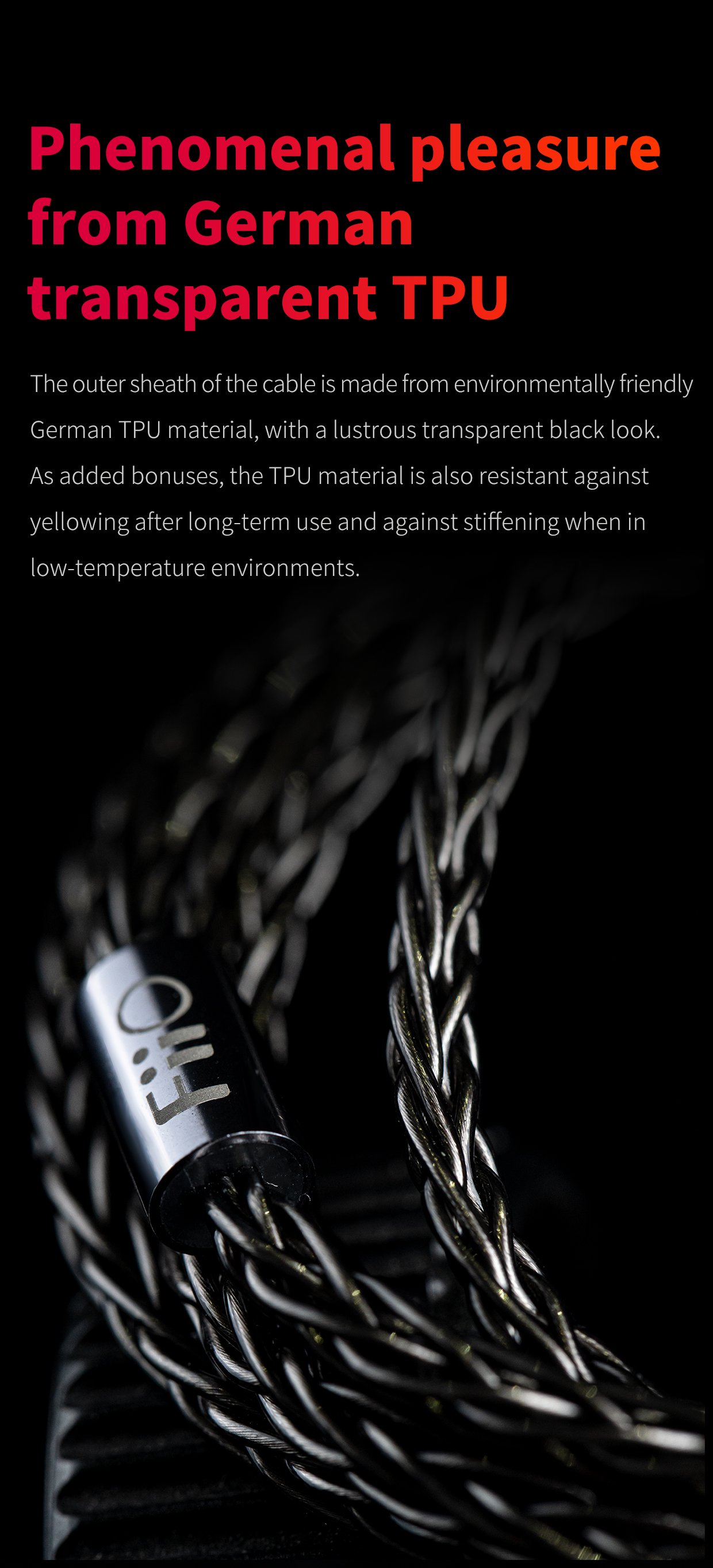 The outer sheath of the cable is made from environmentally friendly German TPU material, with a lustrous transparent black look. As added bonuses, the TPU material is also resistant against yellowing after long-term use and against stiffening when in low-temperature environments.