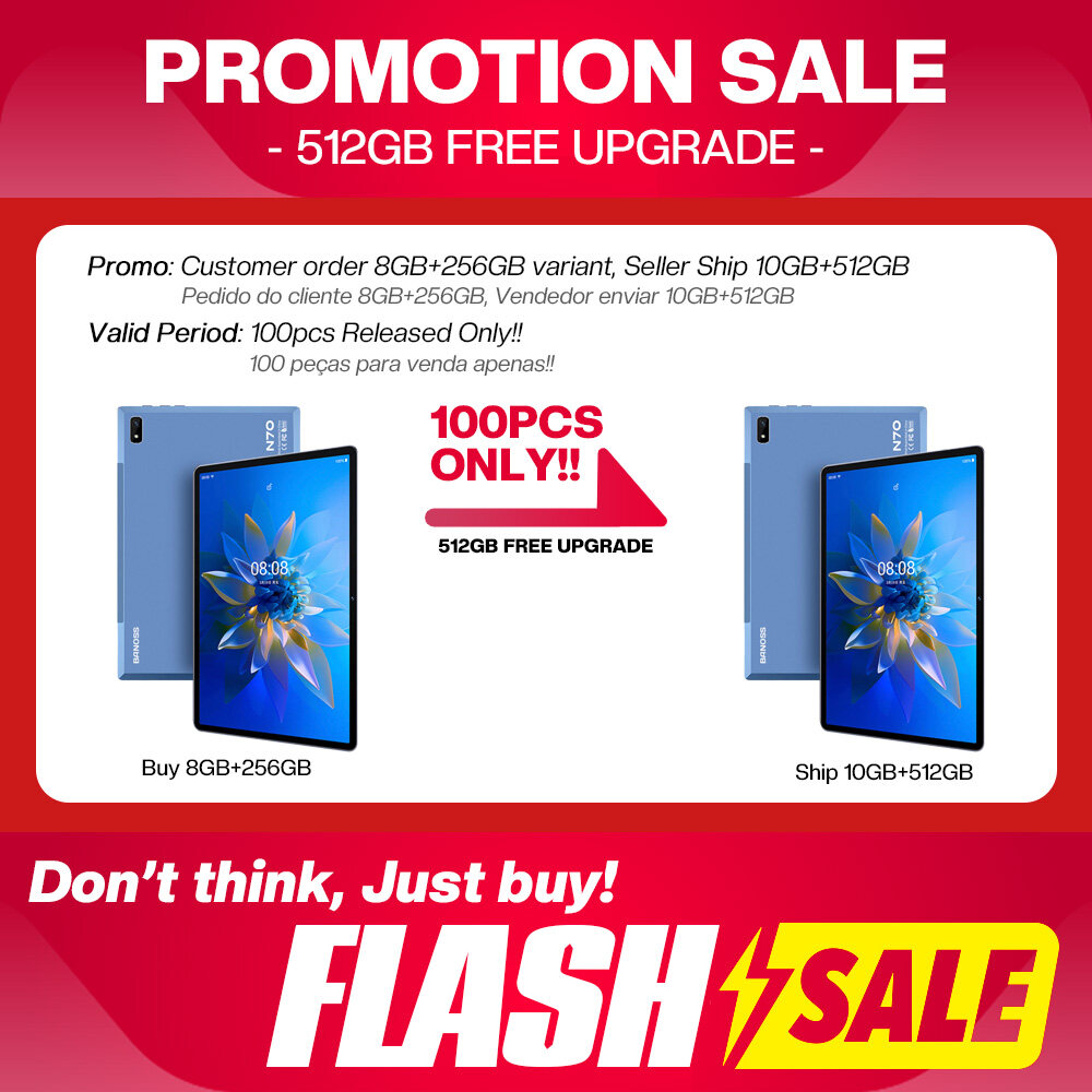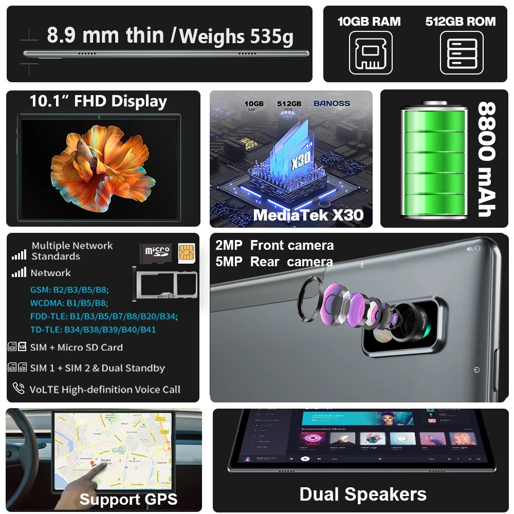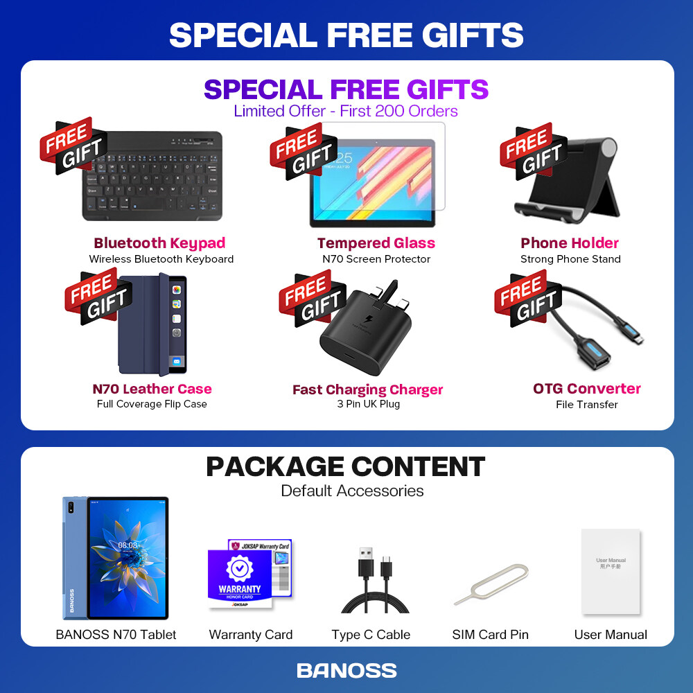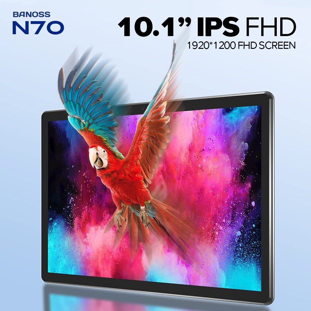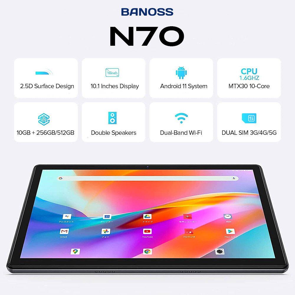 BRAND PROMOTION: 【Buy 256GB Ship 512GB】- Customer just need to order 8GB+256GB variant, then seller will auto ship 10GB+512GB without paying price difference. Limited Quantity Offer 100pcs for sales ONLY!!! WARRANTY: 【1 Year International Warranty】- Comes with BANOSS Official warranty card. We support 1 year free item warranty, in case the item getting any issue without non-aritificial damages, we can repair and even give 1to1 exchange new item. PRODUCT FEATURE: 【SUPERIOR WATCHING EXPERIENCE】BANOSS N70 Tablet is powered by 10-Core Processor. 2022 upgraded Android 11 tablet provides + 40% faster processing speed than regular Quad-Core. 10.1-inch Tablet screen size with 1920x1200 resolution support, perfect for home entertainment and office. DUAL-BAND WI-FI】The 2022 BANOSS N70 Built-in Dual-band wifi module, Support 2.4/5Ghz wifi, the faster wifi you get, the more stable wifi for your smoother watching movie experience. 【DUAL-SIM】The 2022 BANOSS N70 Tablet support dual SIM feature, support 3G/4G/5G netowrk, and also support phone call feature. All-in-One Tablet that make your life experience be more easier and convenient. 【BIGGER THAN BIGGER】The tablet has 8GB RAM, 256GB/512GB internal storage. The GMS Certified latest Android Tablet, with basic Google apps already on and without bloatware. Get rid of unexpected ads and download apps from Google Play, such as SKYGO, NetFlix, YouTube and more. 【LONG LASTING BATTERY】Equipped with a long-lasting and environmentally compliant 8800 mAh battery, this 10-inch tablet will effortlessly provide you with up to 8 hours of support for reading, browsing, watching movies and playing games. The long-lasting battery life and lightweight design allow you to enjoy your tablet anywhere, anytime. 【DUAL CAMERAS AND SPEAKERS】With front 5 MP & Rear 13 MP dual cameras, which would bring your excellent photos and clear video chats. Dual speakers are designed to provide high-quality and powerful sound for your favorite music, games and videos. SPECIFICATIONS: Model: BANOSS N70 (2022) CPU: X30 10-Core System: Android 11 (System Upgradable) Screen Size: 10.1 Inches IPS Screen Screen Resolution: 1920 * 1200 WiFi: Dual Band 2.4G/5Ghz WiFi Bluetooth: BT 4.0 Battery: 8800mAh Li-on Battery Camera: Front 5MP + Rear 13MP Speaker: Dual Stereo Speaker RAM: 6GB/8GB/10GB ROM: 128GB/256GB/512GB Cellular: 3G/4G/5G DUAL SIM Charging Port: Type C WHAT'S IN THE BOX: 1 * Tablet PC 1 * User Manual 1 * Type C Cable 1 * SIM Card Pin 1 * Official Warranty Card SPECIAL FREE FITS: 1 * Leather Flip Case (Limited Gifts) 1 * Bluetooth Keyboard (Limited Gifts) 1 * Tempered Glass Screen Protector (Limited Gifts) 1 * OTG Converter (Limited Gifts)