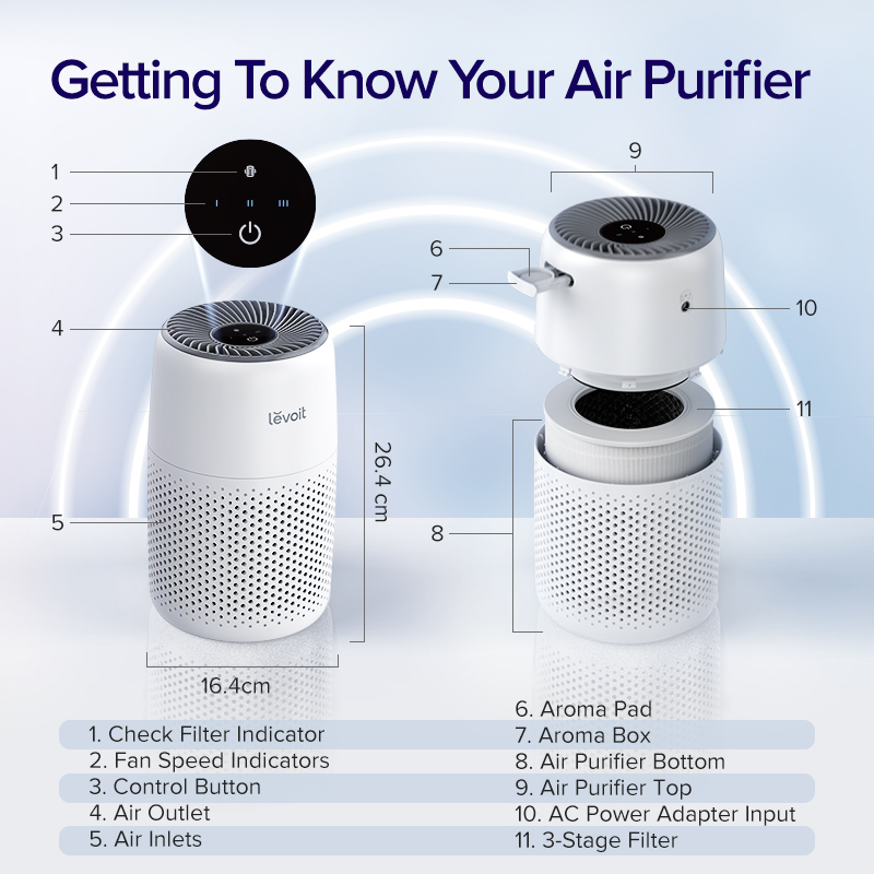 Levoit Core Mini Aromatherapy Air Purifier with 3-Stage Filtration to remove 97% of airborne particles 0.3 microns in size, including dust, smoke and unpleasant odour. Tailor ambience with preferred e
