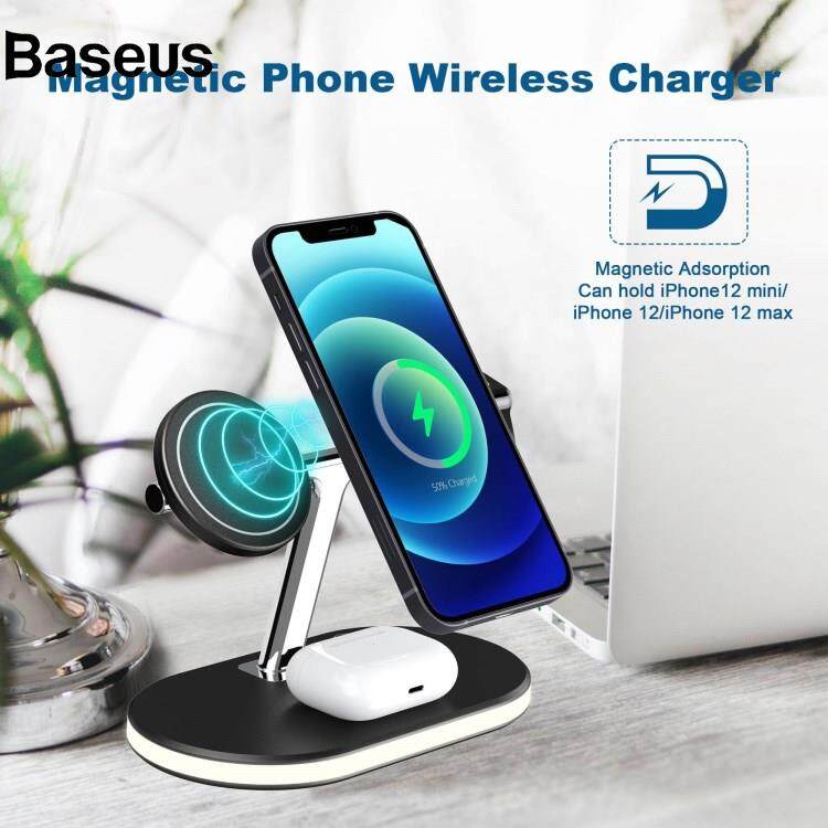 Baseus C300 3 in 1 15W Fast Charging Desktop Station with LED Night Light Magnetic Wirless Charger for Qi-enabled Mobile Phone / AirPods / Apple Watch